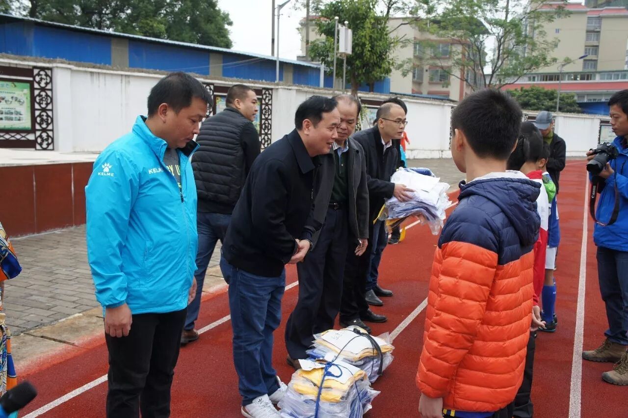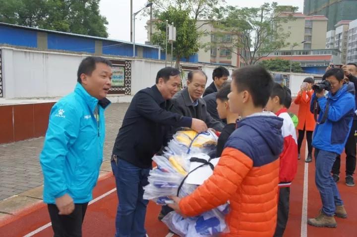 當天,柳江區(qū)足球協(xié)會主席韋傳志先生、柳江區(qū)教育局副局長韋莉女士、飛喬體育器材有限公司李崇山先生等一同出席了此次捐贈服裝儀式。